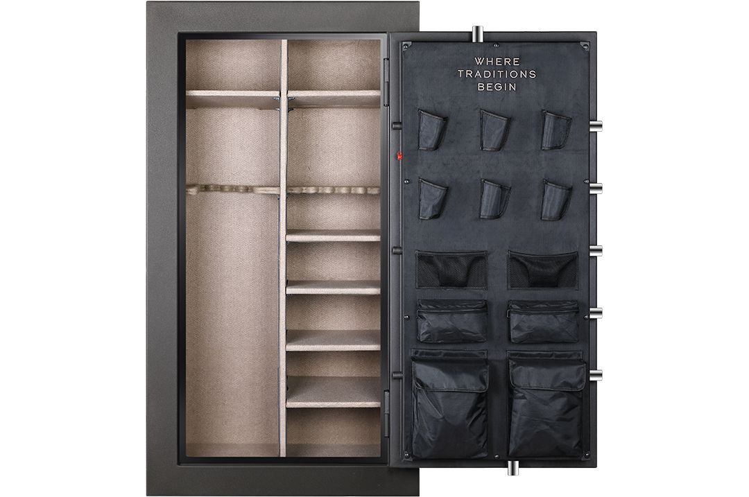 Able to store up to 24 rifles or shotguns along with 4 additional handguns the sportsman 24 gun fire safe is qai verified to 1400 degrees for up to 30 minutes and features a 3 number e lock with a customizable code.